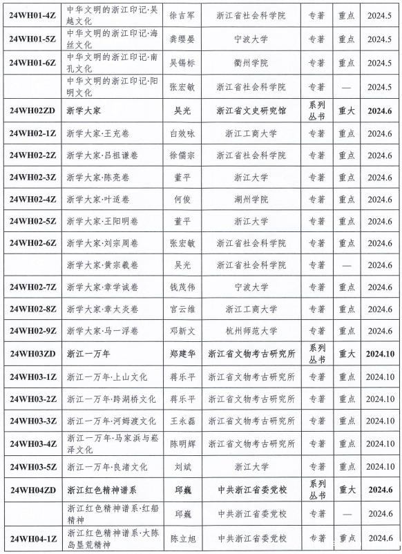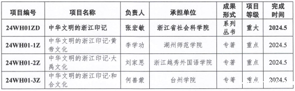 根据省委宣传部关于“理论研究传播行动”重点丛书编纂工作的部署安排,以及《浙江省习近平新时代中国特色社会主义思想研究中心课题管理办法》《浙江文化研究工程项目管理办法》规定,经浙江省习近平新时代中国特色社会主义思想研究中心和浙江省哲学社会科学工作办公室审批,决定《中华文明的浙江印记》等立项为浙江文化研究工程项目,现公布如下: